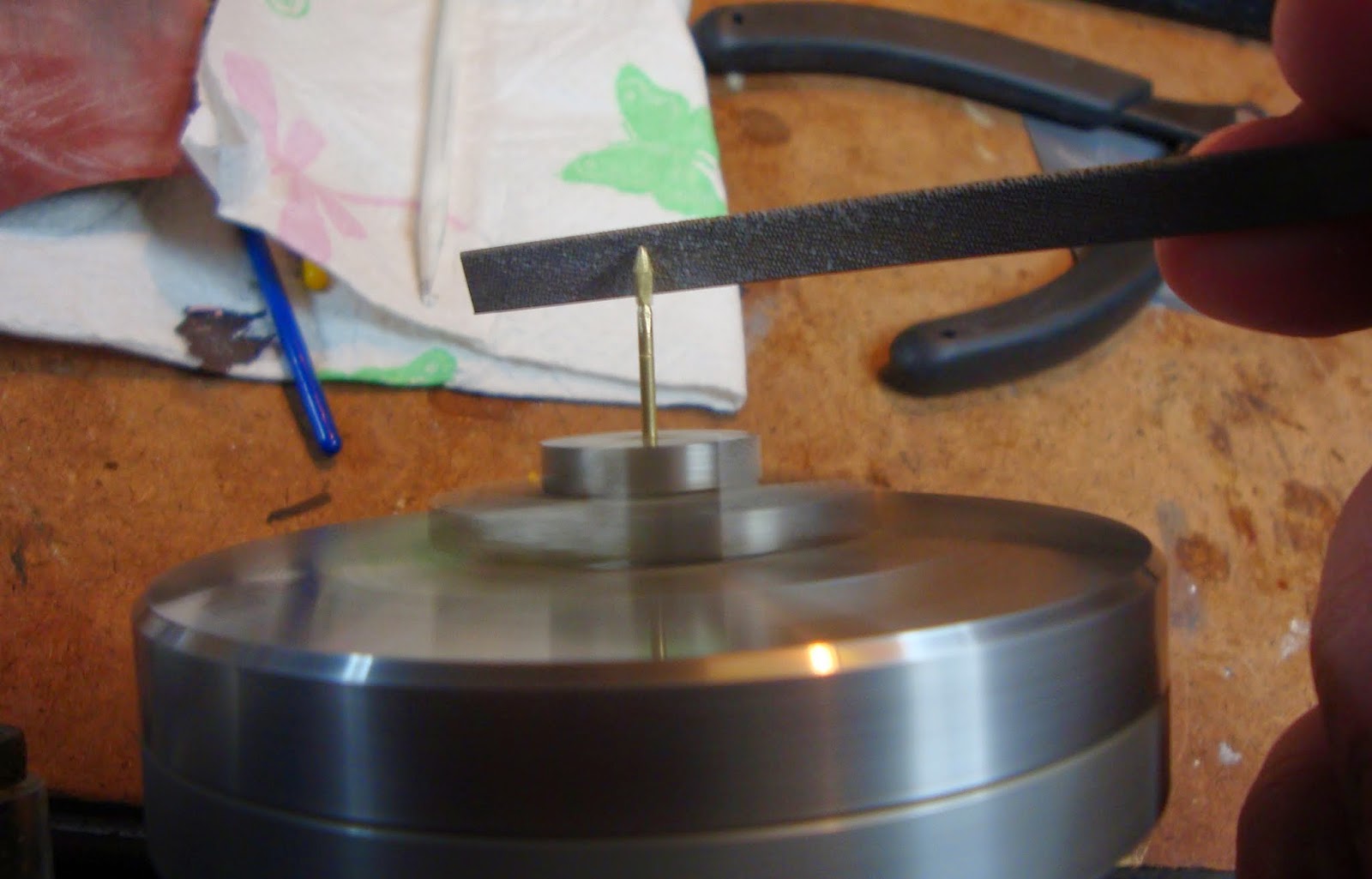 Fig. 7 The lathe chuck is separate from its lathe bed; I hold the assembly in my lap, turn the motor up to a few hundred rpm, and file and sandpaper the spearhead into shape. This is probably not the safest way to operate the lathe head. Do not try this at home, &c &c.